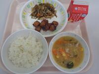 献立:ご飯・牛乳・かつおの南蛮漬け・すき昆布の煮物・どさんこ汁