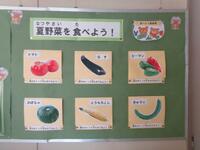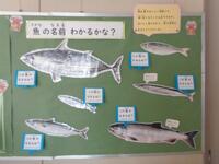 小中学部の職員室の廊下の壁面に「給食の掲示板」があります。献立表や給食だよりの他に、季節に合わせて食に関する掲示をしています。8月から9月前半は夏野菜について、9月後半からは魚について、写真や名前を掲示しています。掲示物は、児童生徒が掲示物をめくったりして体験できるようになっており、魚は、名前を当てるクイズになっています。